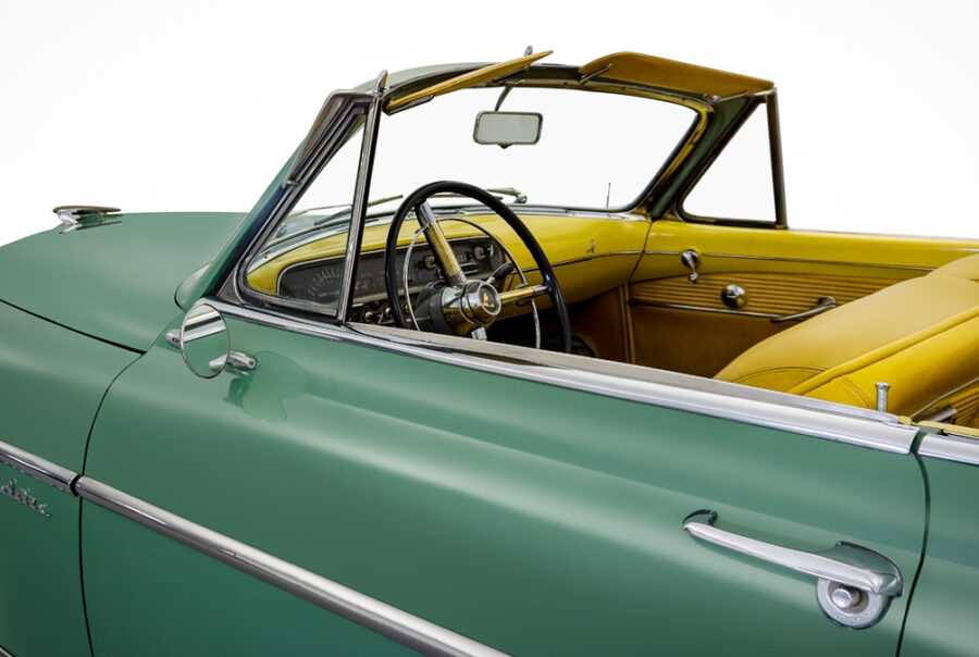 This Cosmopolitan wears Radiant Green Metallic paint and has a Yellow leather interior and Green Hartzcloth convertible top. For the 1951 model year, the chrome trim over the front wheels was replaced with a longer trim piece that ran the length of the car and gave it a cleaner and more-conventional appearance.