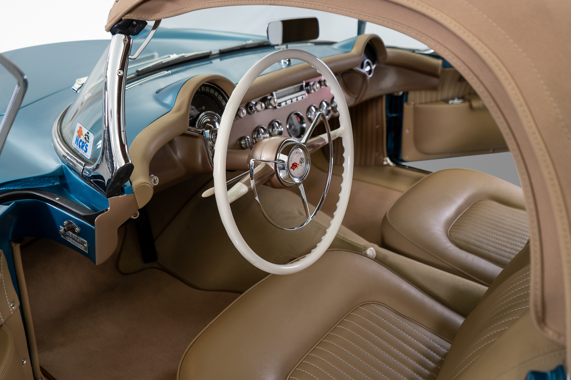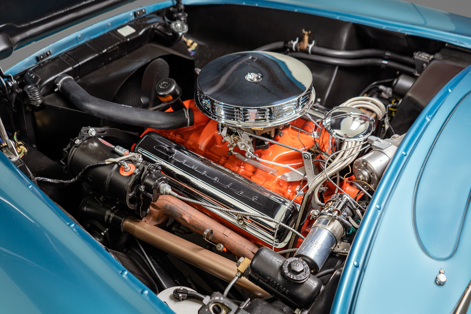 Corvette offered 2 different configurations in 1955. This one is the “Blue Flame Powerglide” version, featuring a 6-cylinder, 235 cubic inch engine. Only six of these cars were built in 1955. This was the first American-built performance engine, and it set the table for the following seven decades of Corvette performance.